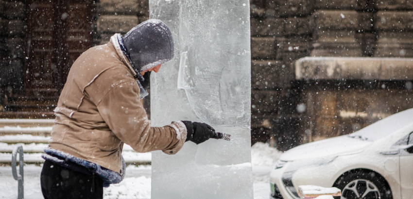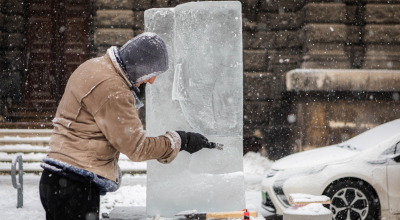 Élő jégszobrászat: 120 kilós jégtömb, négy óra munka, jégperzselés, minimalista fej, nagy hideg. Wessel Martin szobrászhallgató jégszobra megtekinthető az MKE főbejáratánál, amíg el nem olvad.