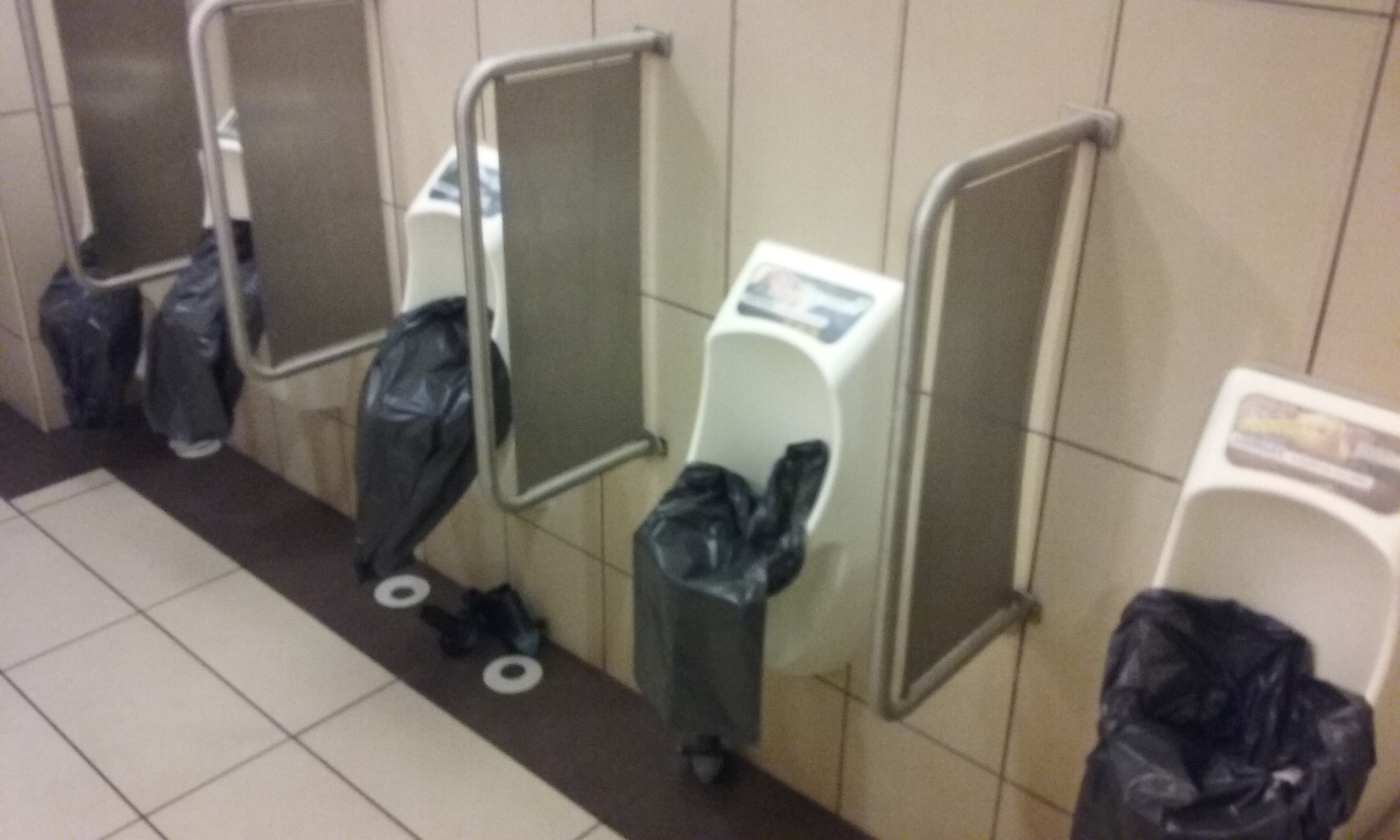 E sorok írója tegnap járt a dél-budai bevásárlóközpontban, mely a buszos mellett vasúti megközelíthetőséggel is rendelkezik. Az egyébként tiszta plázában az egyik férfi mosdó olyan állapotban van, hogy az semmiképpen sem nevezhető higénikusnak és megfelelő színvonalúnak. A pisszoárokat szemeteszsákokkal takarták le, nem tudni miért. Hogy ne használják? Vagy egyszerűen azért, mert egyik sem működik?