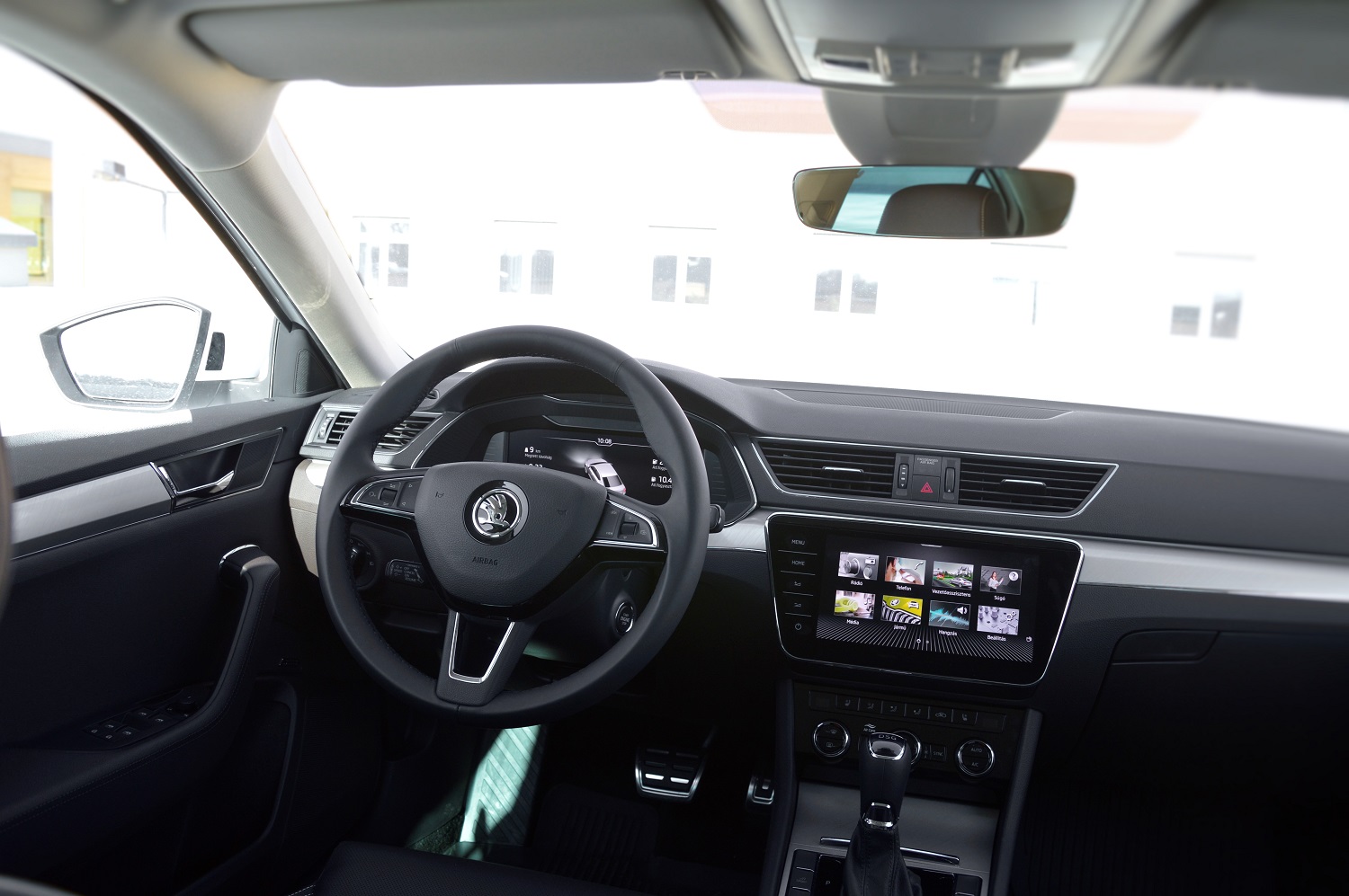 Tesztautónk Laurin&Klement felszereltségben érkezett, amelynek része a bőr bevonatú utasülés, a hátsó ablakoknál elérhető napellenzőroló, a 12 hangszórós Canton-hangrendszer, valamint a háromzónás klímaberendezés. Az ízléses eleganciába öltöztetett utasteret a műszerfalon végig futó vékonycsíkos, éjszakai LED-világítás teszi teljessé. A teljesség igénye érdekében fontos megjegyezni, hogy komfortnövelő tényezők mellett a Laurin&Klement csomag magában foglalja a 18 colos könnyűfém keréktárcsákat, a nagy felületű, színes, digitális fedélzeti komputer kijelzőt („Maxi Dot”), valamint az adaptív lengéscsillapítás szabályozást is (DCC).