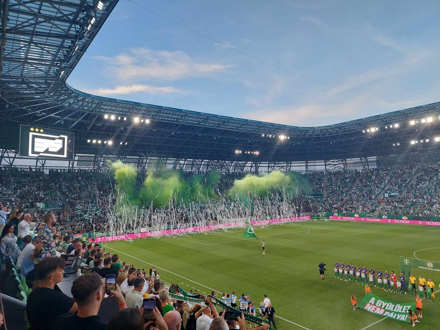 A Ferencváros - Újpest mérkőzés hangulatára egyáltalán nem lehetett panasz, noha az ultrák csapataik buzdítása mellett néha egymást is kóstolgatták különféle rigmusokkal. A Fradi B-közép varázslatos koreogáfiával hangólódott a meccsre, de a találkozón talán kissé túlsúlyba kerültek a pirotechnikai eszközök. Szerencsére azonban a foci szerelmeseinek nem kellett ezzel foglalkoznia, mert rögtön a találkozó második percében hatalmas helyzet tárult a Fradiban játszó Gruber Zsombor elé.