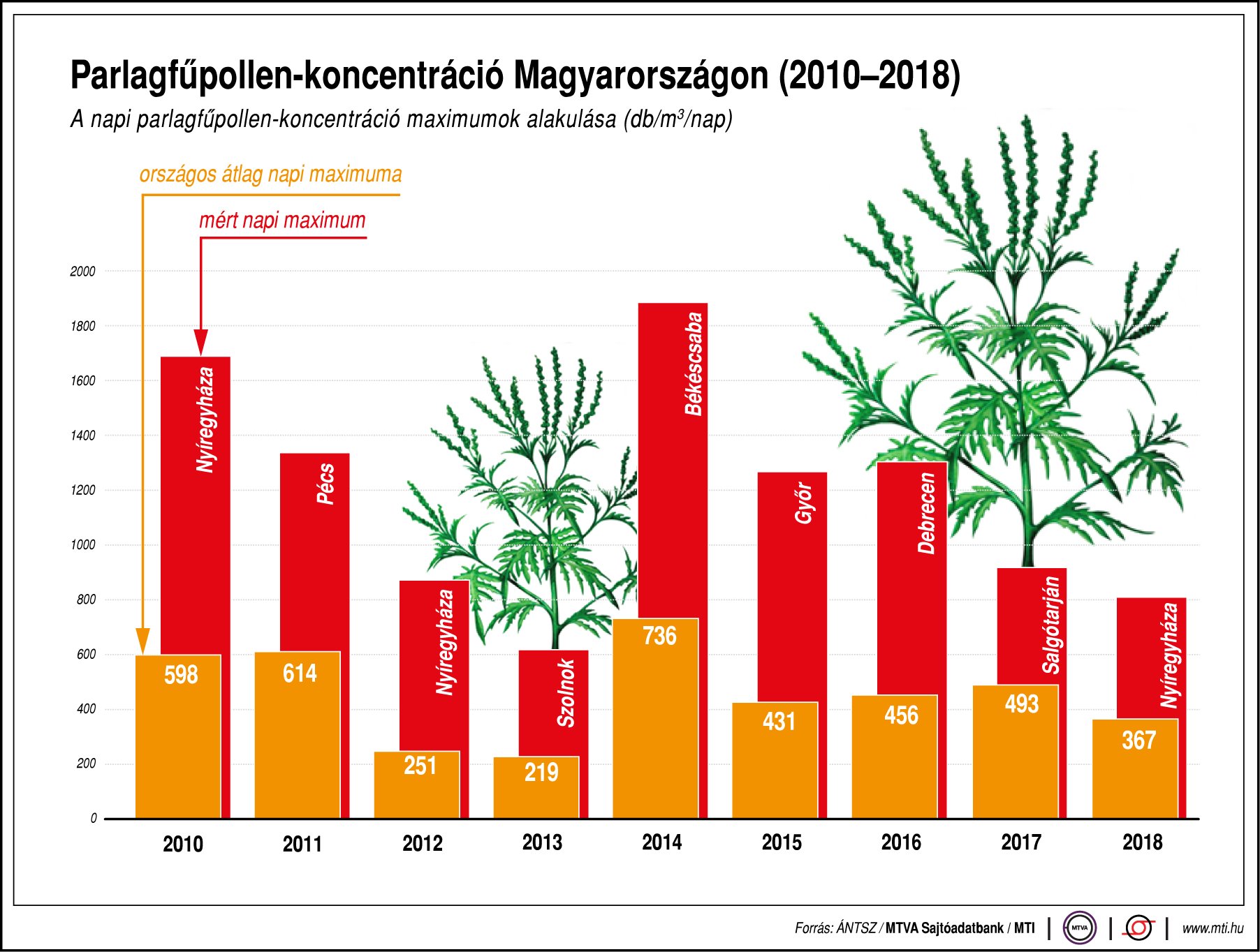 Hétfőn a parlagfű pollenkoncentrációja az ország nagy részén elérte a nagyon magas szintet. Az Alföldön, a főváros térségében, valamint a Dunántúl keleti területein a gyomnövénnyel erősen fertőzött területek környezetében azonban a pollenszennyezés elérheti az extrém magas szintet is - közölte a tisztifőorvos hétfőn a Facebook-oldalán. Ugyanakkor az elkövetkező napokban átvonuló hidegfrontot kísérő csapadék, valamint az erőteljes lehűlés hatására várhatóan országszerte jelentősen mérséklődni fog az allergiát okozó pollenterhelés.