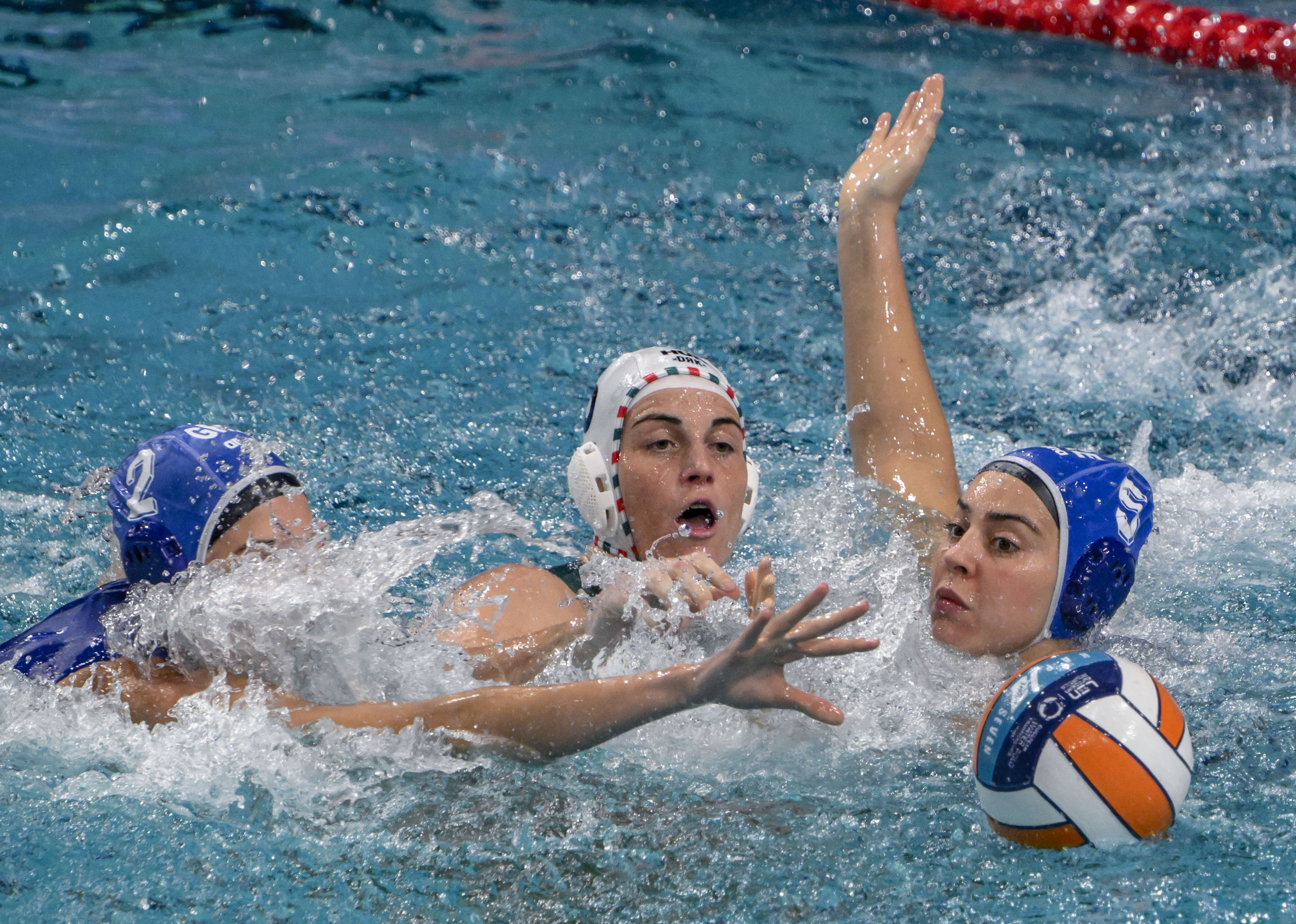 A háromszoros olimpiai bajnok úszó, Pieter van den Hoogenband nevét viselő uszodakomplexumban rendezett összecsapás - amelyről a keretből Szabó Nikolett és Faragó Kamilla maradt ki - mindkét oldalon két ki nem használt fórral indult. Az első gólt a magyarok szerezték, Gurisatti akcióból laposan lőtte ki a bal alsó sarkot, de a túloldalon azonnal jött a válasz a görögöktől, akik ezután egy jó védekezés és egy szép összjáték után előnybe kerültek. Leimeter a harmadik magyar előnyt már értékesítette, de a görögök sem hibáztak létszámfölényben és visszavették a vezetést. Vályi szép labdaszerzése után az Eb-újonc Kuna megúszásból talált be, de Xenaki jobbról jobb kézzel gyönyörűen húzta be a labdát jobb felsőbe. Fél perccel a negyed vége előtt Rybanska harcolt ki ötméterest, amit Keszthelyi értékesített (4-4).
