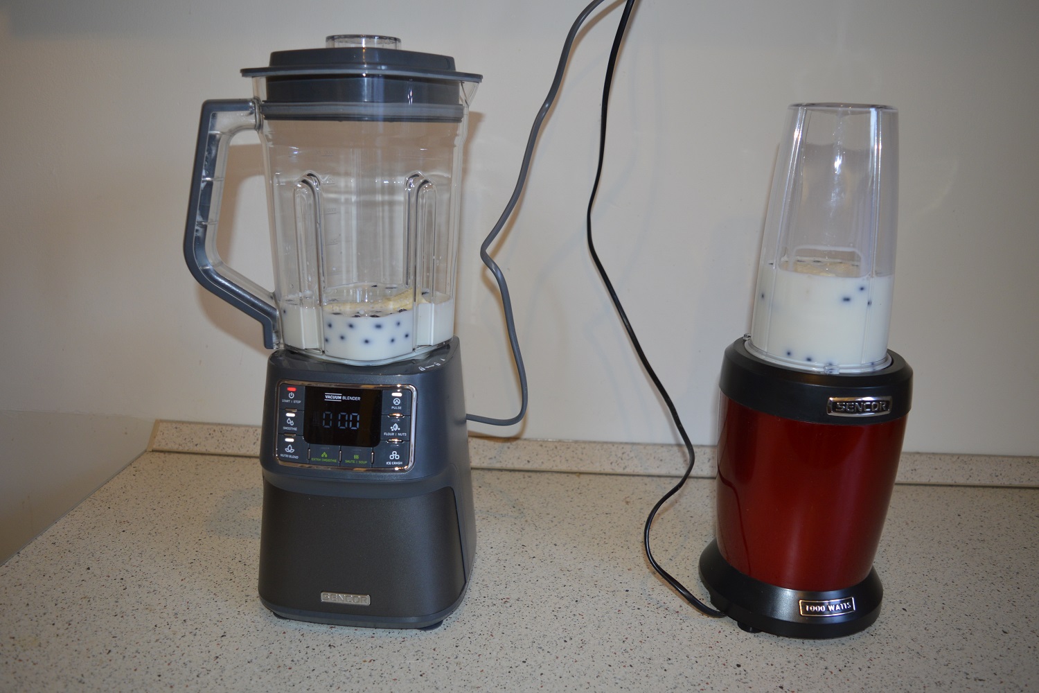 A feladat mindkét készülék előtt adott volt. El kellett készíteniük egy, az édesszájúak körében nagy népszerűségnek örvendő italt, az áfonyás-banános smoothie-t. Az igazságos verseny érdekében a hozzávalókat kimértük. 2x3 dl tejet, egy-egy marék áfonya, 1 darab félbe vágott banánt használtunk fel a teszthez. Ettől függetlenül a képek csalókák lehetnek, hiszen a nutri mixer 0,8 literes, a vákuumos pedig 1,5 literes mixelő edénnyel rendelkezik. Optikailag tehát úgy tűnhet, hogy kevesebb van az egyikben, mint a másikban. Az igazat megvallva azonban mindennek csekély jelentősége van, hiszen a két gép közötti különbség elsősorban a smoothie elkészítésénél fog kijönni.
