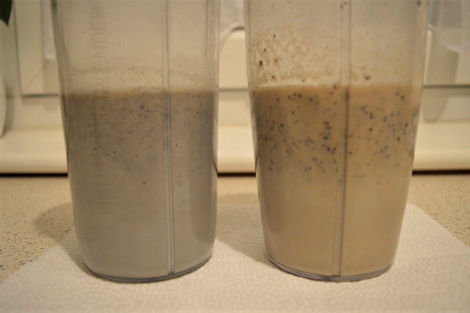 A bal oldali a vákuumos mixer, a jobb oldali pedig a nutri mixer műanyag pohara, közel két órányi állás után.