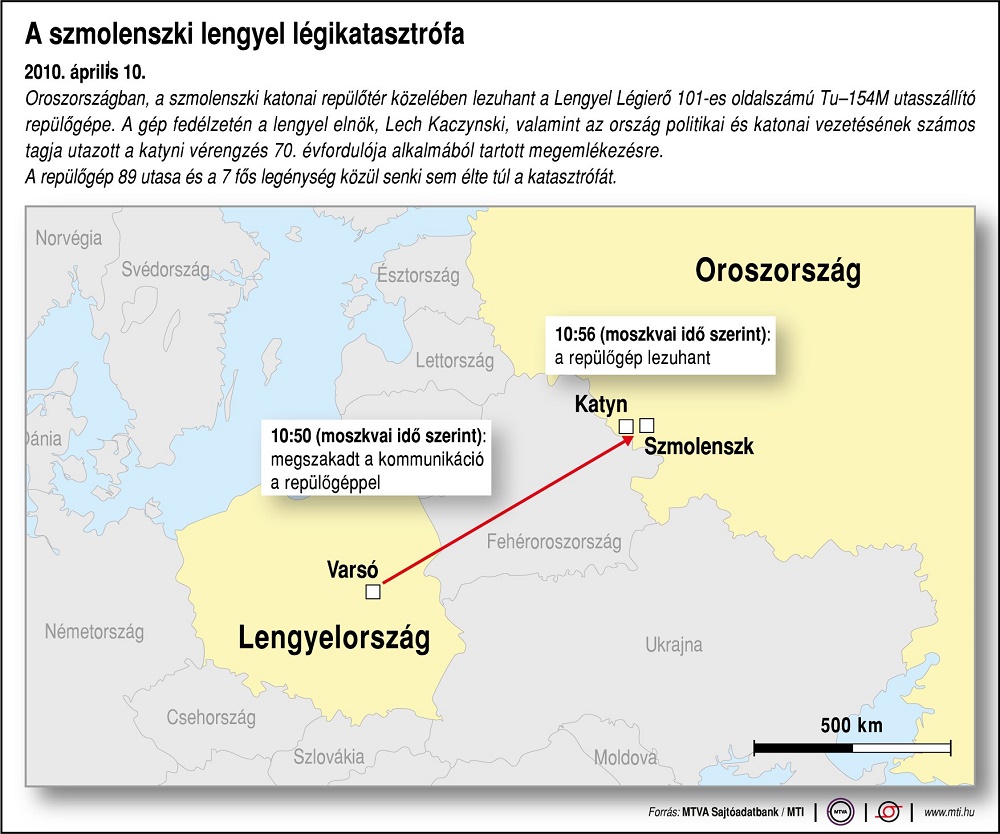 Varsó a tragédia óta többször is - utoljára tavaly szeptemberben  - felszólította Moszkvát a repülőgép roncsainak visszaszolgáltatására, Oroszország azonban ezt mindeddig nem tette meg, hivatkozva az ügyben máig nem lezárt orosz ügyészségi eljárásra. Tavaly azonban két alkalommal Moszkva lehetővé tette, hogy a roncsot a helyszínen, orosz szakértők jelenlétében megvizsgálják a lengyel ügyészség képviselői. A roncs Lengyelországba szállítását az Európai Parlament 2015-ben, valamint az Európa Tanács (ET) 2018-ban elfogadott állásfoglalása is sürgette. A légikatasztrófa okai máig tisztázatlanok, a 2011-ben közzétett jelentésekben az orosz és a lengyel nyomozóhatóságok eltérő részeredményekre jutottak, bár egyaránt lényegében emberi hibákra vezették vissza a történteket.