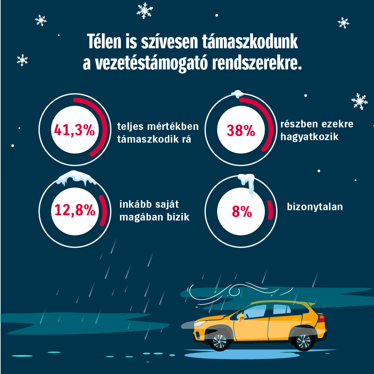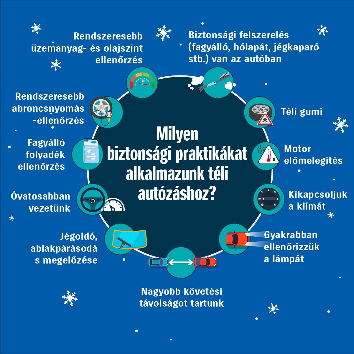 Jó hír azonban az, hogy az elmúlt évek közlekedésbiztonsági kampányai eredményesek, hiszen az autósok több mint 84 százaléka téli gumit használ (további 13,5% pedig négy évszakosat) és minden harmadik gépjárművezető – függetlenül az időjárástól - már novemberben gondoskodik a nyári abroncsok lecseréléséről. De nemcsak az évszaknak megfelelő gumikban, hanem egyéb más lehetőségekben is bízunk a minél biztonságosabb vezetés érdekében. Az autósok több mint kétharmada részben vagy teljes egészében támaszkodik a vezetéstámogató rendszerekre a téli hónapokban, miközben a megkérdezettek 12,8 százaléka inkább a saját képességeiben bízik. Emellett kiemelt figyelmet fordítunk a rendszeres abroncsnyomás ellenőrzésre, az üzemanyag-, olajszint és fagyálló folyadék ellenőrzésre. Bevett szokás a motor előmelegítése és a megkérdezett autósok odafigyelnek arra is, hogy autójukból ne hiányozzanak olyan biztonsági felszerelések, mint a jégoldó, jégkaparó és hólapát.