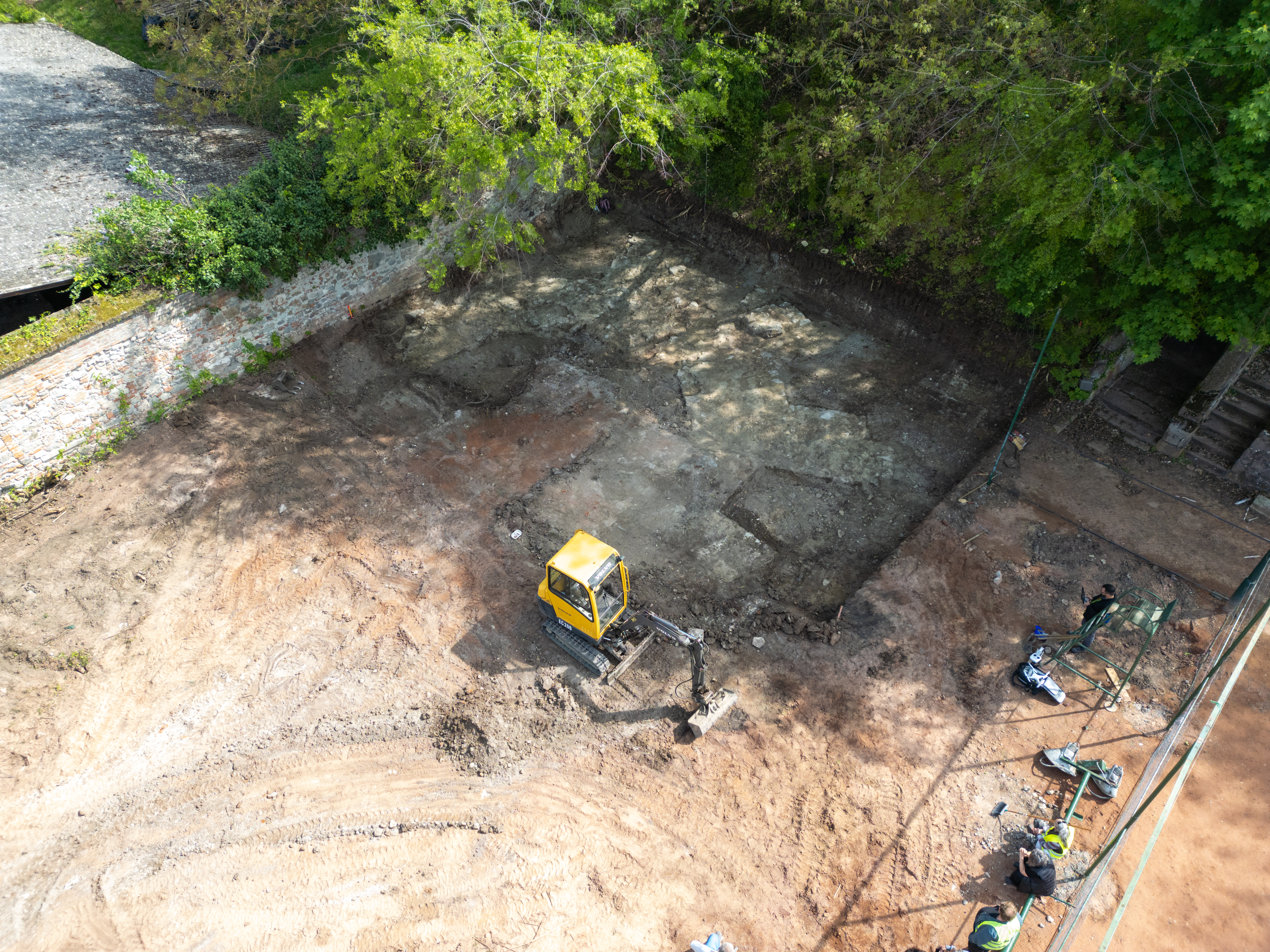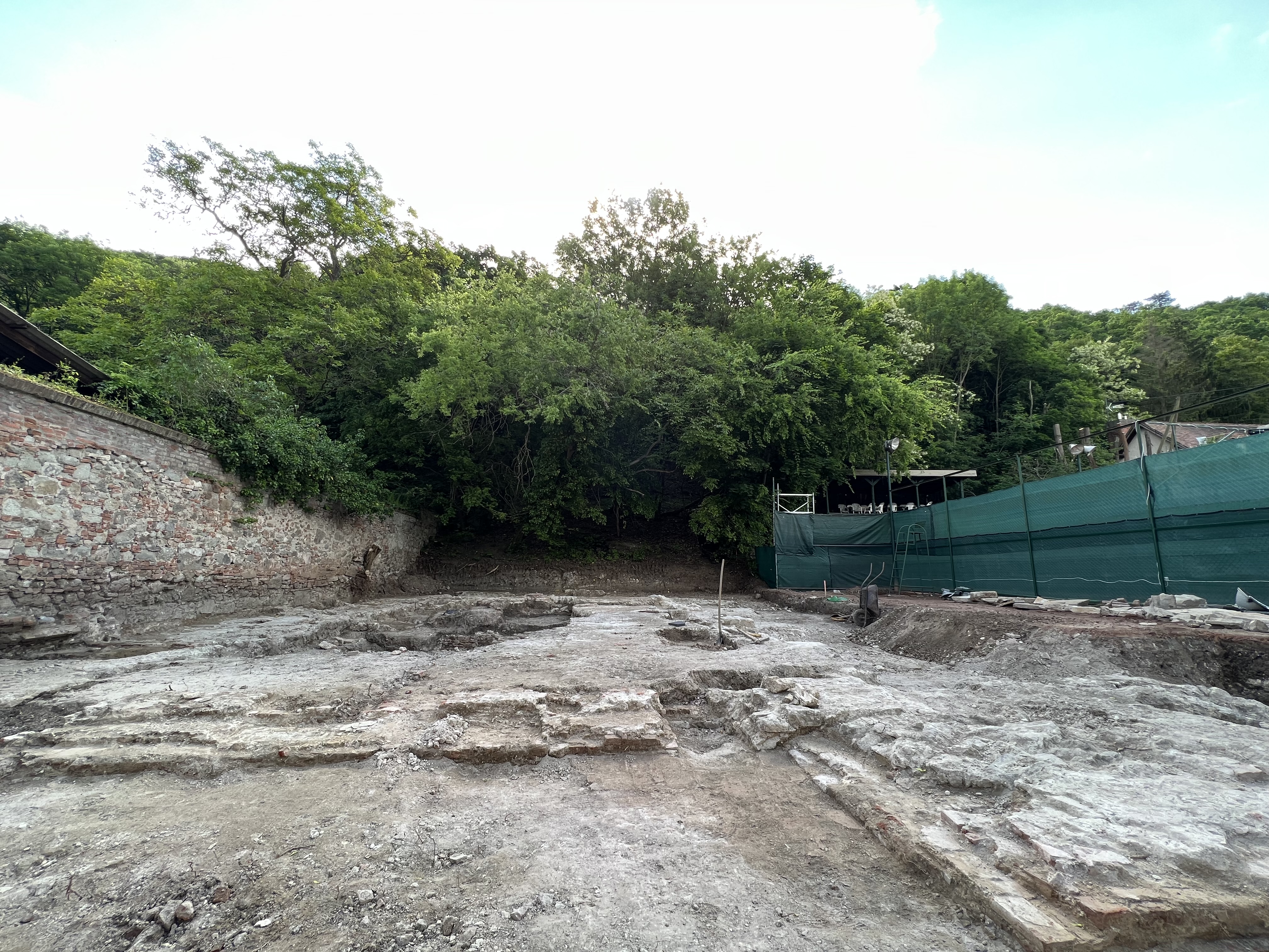 A régészek számára legígéretesebbnek a királyi palota szomszédságában található teniszpálya feltárása bizonyult, ahol egykor a Zsigmond király alapította ferences kolostor állt. Már az első napon megtalálták a templom maradványait, majd a főoltár előtt egy kripta is előkerült, amelyre ráomlott a szentély több mint száz darab későgótikus boltozati bordája. A beomlott kripta törmelékei között három holttest csontmaradványa feküdt. A mellettük talált tárgyak – például egy sarkantyú és számos ólom puskagolyó – alapján, feltehetően katonák lehettek. Egy réztál volt a közelükben, amit talán védekezésre használtak, mivel felületén fegyverek által ejtett mélyedések láthatók. Mindez arra utalhat, hogy a templom nemcsak a fosztogatásnak, hanem egy véres összecsapásnak is színhelye lehetett. Vélhetően 1544 után omolhatott be, amikor Visegrád oszmán-török kézre került, évszázadokra eltemetve a királyi vár egykori gazdagságának és pusztulásának emlékeit, melyeket a régészek ásója hozott ismét napfényre.