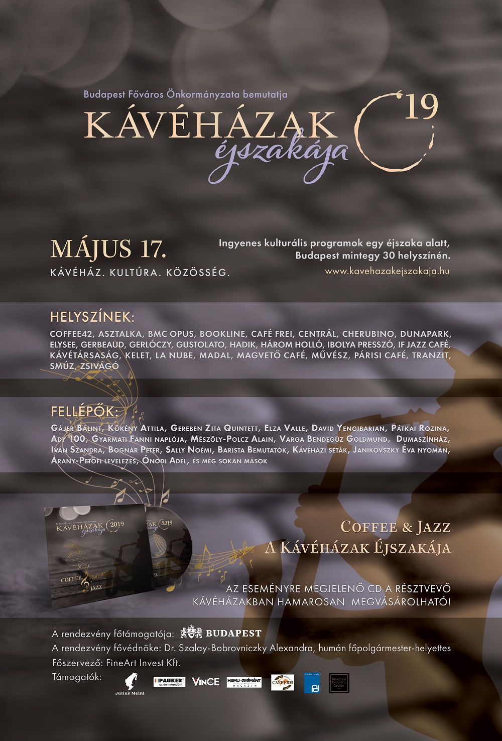 „A Budapest Főváros Önkormányzata kezdeményezésére és főtámogatásával tavaly útjára induló Kávéházak Éjszakájának fő célja, hogy felelevenítsük és népszerűsítsük a mára feledésben lévő budapesti kávéházi kultúrát, hogy egy éjszaka erejéig megmutassuk Budapest ékköveit és azt, hogy a kultúra mellett szeretteink, barátaink társaságában eltöltött idő nyújt a legtöbbet mindennapjainkhoz. A kulturális események szervezésénél idén is különös hangsúlyt fektettünk az irodalmi és zenei programok szervezésére. A kávéházi hangulathoz leginkább illeszkedő zenei irányzat, a jazz szerelmesei számos koncert közül válogathatnak.” – foglalja össze Serfőző Krisztina, a kezdeményezés főszervezője.